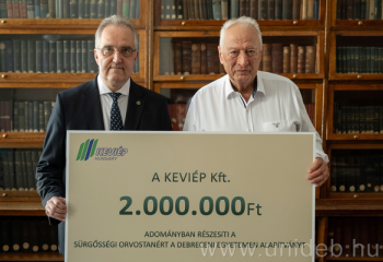Kétmillió forint adományt kapott a Sürgősségi Orvostanért a Debreceni Egyetemen Alapítvány a KEVIÉP Építőipari és Kereskedelmi Kft-től. A felajánlásból az oktatás és a kutatás támogatása mellett a betegellátás fejlesztéséhez szükséges eszközök beszerzése is megvalósulhat.